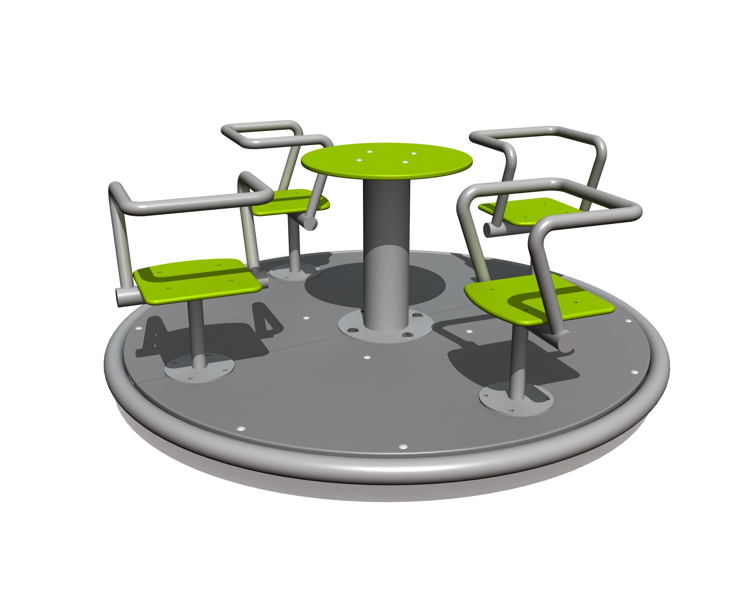 Karrusellen er designet til børn fra 2 år. Den roterer jævnt på kuglelejer omkring en central akse og monteres i jorden med et betonfundament. Bevægelse genereres manuelt ved at skubbe udefra, det centrale bord er stationært og roterer ikke med karrusellen.