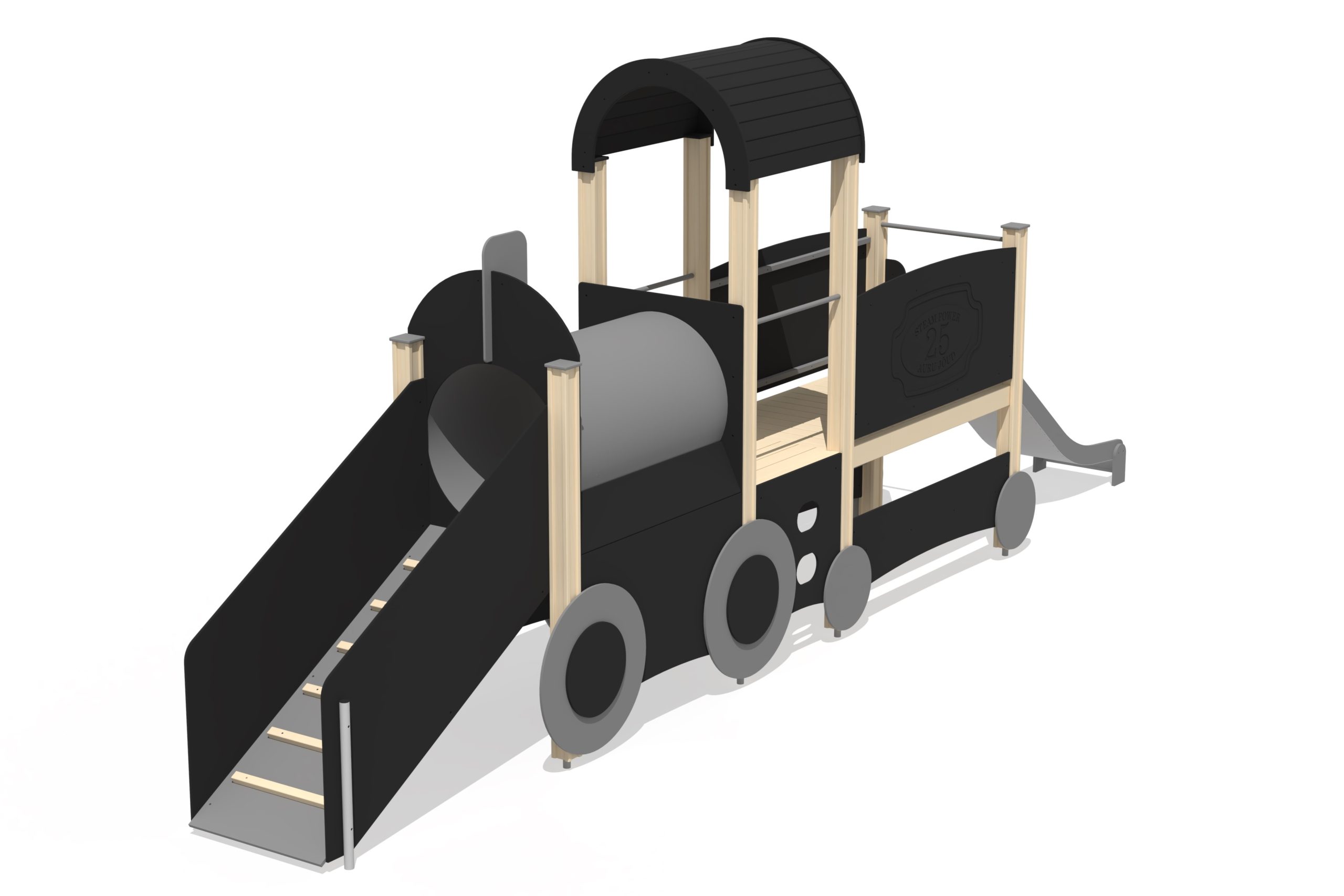 Legebanen med rutsjebane er designet til små børn. Børn kan få adgang til den 0,95 m lange platform med rutsjebane ved at bruge en rampe med trætrin, en kravletunnel eller fodfæste på klatrevæggen midt i legetoget.